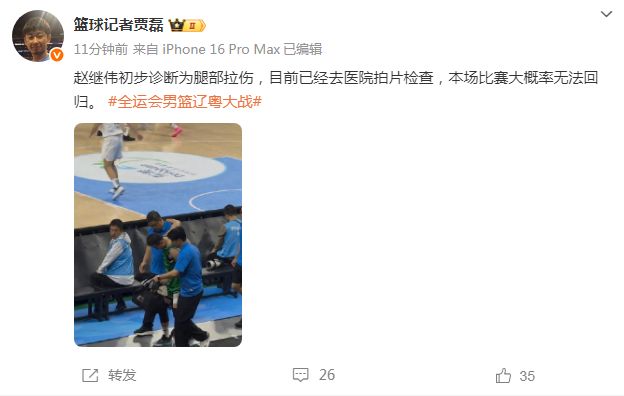 北京时间11月11日,2025年全运会男篮焦点辽粤大战半决赛,卫冕冠军辽宁队遭遇重创。根据篮球记者贾磊报道,赵继伟仅出战7分钟,就遭遇腿部拉伤,已经去医院拍片检查,大概率无法回归比赛。
