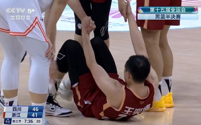 第三节王奕博挤过防守时倒地,膝盖撞了一下。
