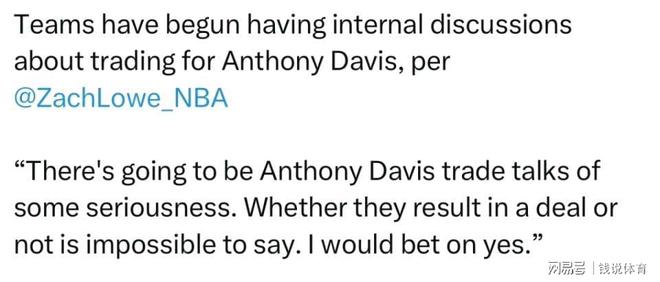 北京时间11月13日,联盟资深记者Zach Lowe的一则重磅报道打破了NBA的平静:“接下来将会出现具有一定严肃性的安东尼-戴维斯交易谈判。最终是否达成交易尚难断言,但我个人倾向于认为交易成行的可能性更大。”