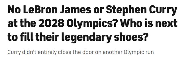 “你早知道我的答案,”詹姆斯说,“我会在电视机前观看比赛。”2028年奥运会举办时,詹姆斯将年满43岁,库里则刚满40岁。库里的表态不像詹姆斯那样彻底关上大门,但他告诉播客《Mind the Game》联合主持人、发问的纳什,自己参赛的可能性极低。